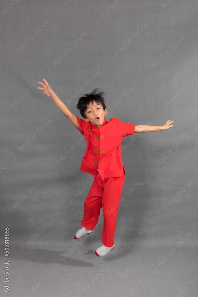 motion blur strength. little boy fashion Smiling child in red Very well made.